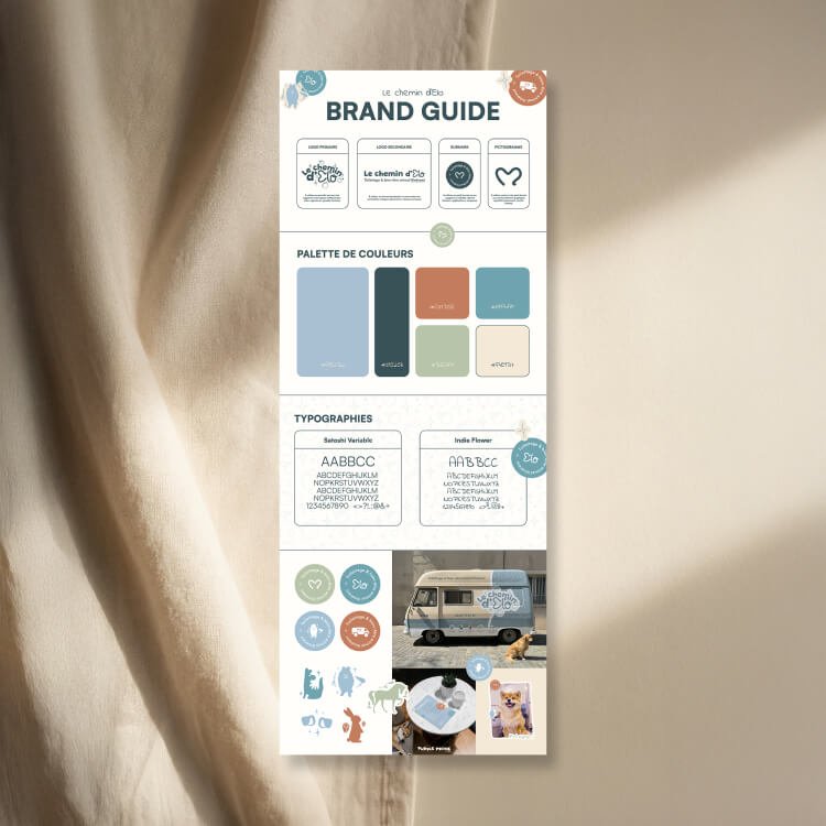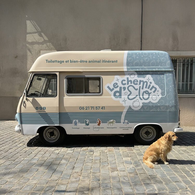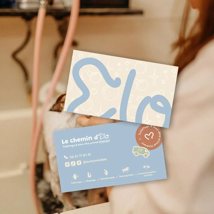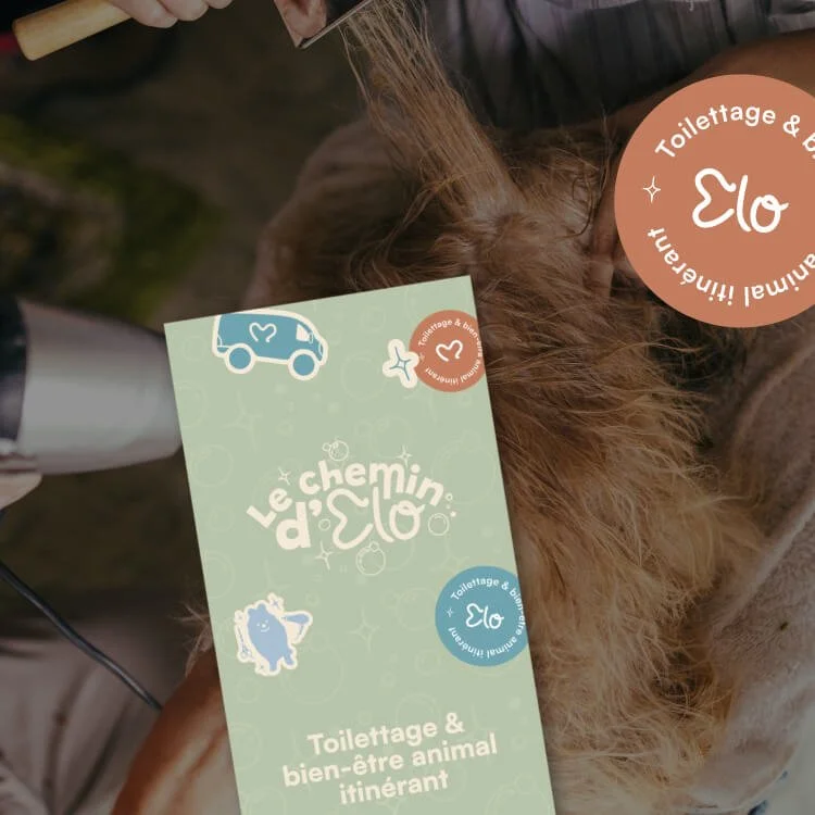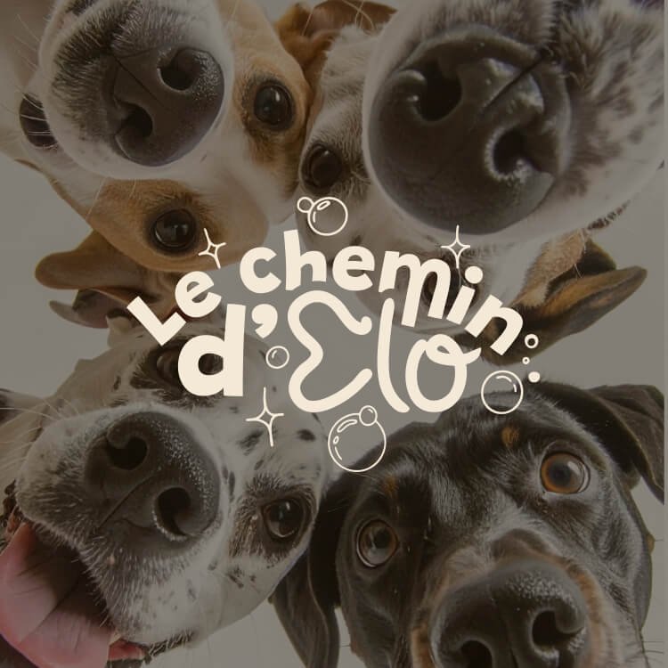 Le Chemin d'Élo, c'est un service de toilettage itinérant. Elony se déplace directement chez ses clients pour prendre soin de leurs animaux. Une activité humaine, de proximité, qui avait besoin d'une image à la hauteur de ce lien particulier entre une professionnelle et ses clients à quatre pattes.